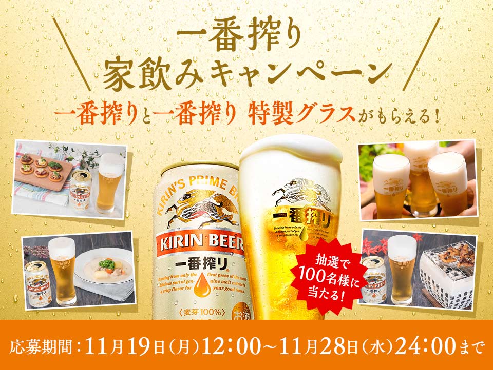 キリン一番搾り生ビールと特製グラスを抽選で100名様にプレゼントいたします。