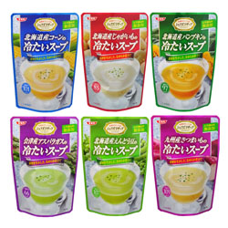 レトルトパウチタイプで、北海道産コーン、じゃがいも、パンプキン、えんどう豆、会津産アスパラガス、九州産さつまいもの計6種類。主原料の野菜を国産に限定し、野菜の“豊かな風味”を引き出したのど越しのよいなめらかな味わいのスープです。